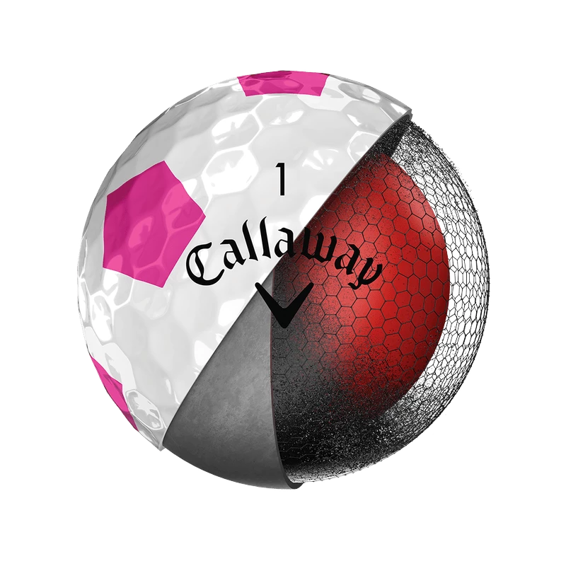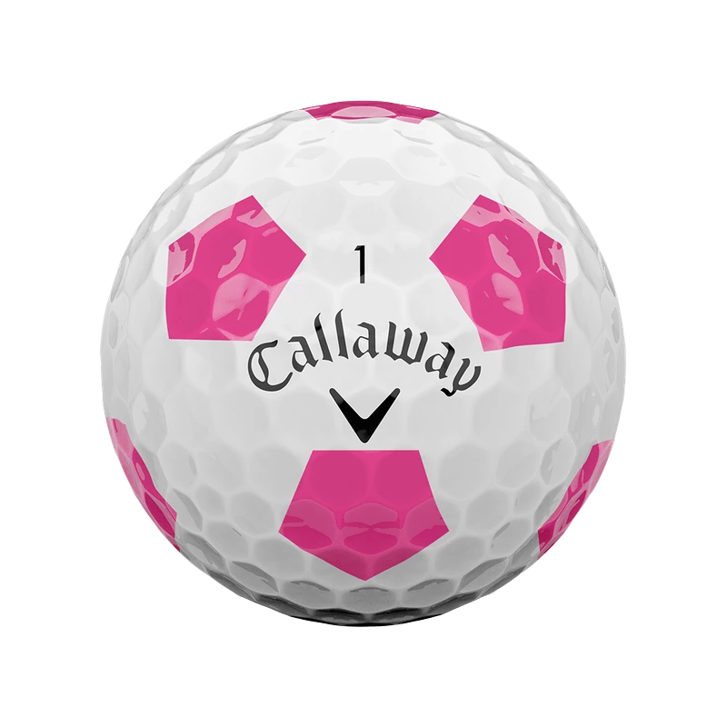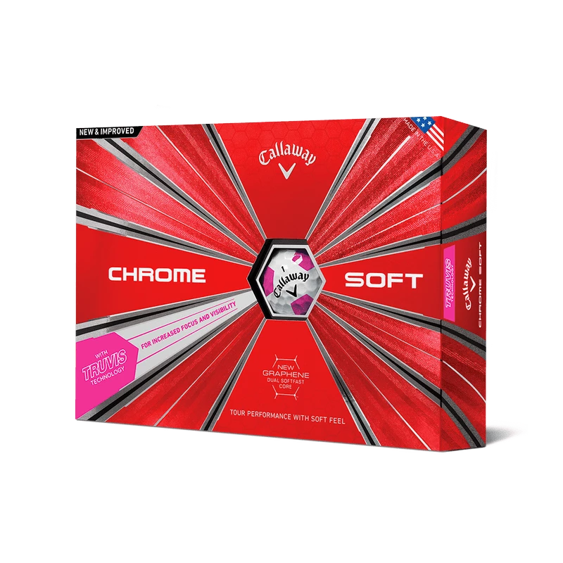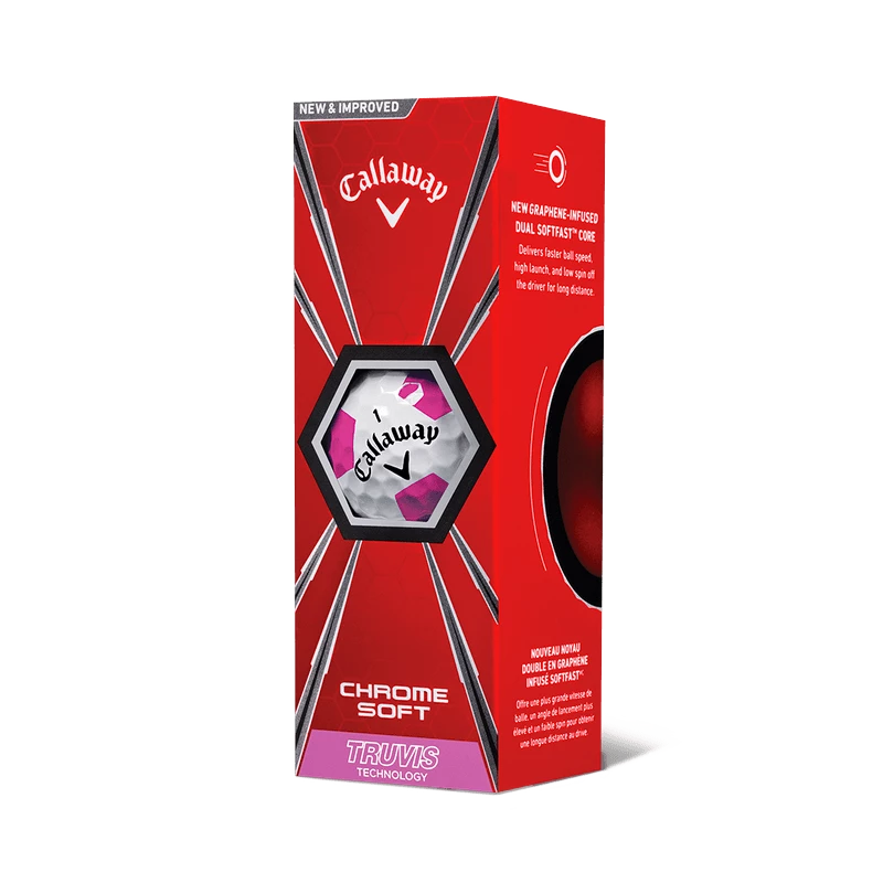 The new Chrome Soft Pink Truvis Golf Ball combines Tour-proven performance with unparalleled feel, exceptional mis-hit forgiveness, and Truvis technology in a pink and white pattern.