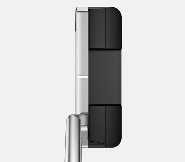 Tungsten toe and heel weights provide stability and forgiveness for improved accuracy, and the shallow milled face delivers a firmer feel, crisp sound and consistent ball speed. The platinum topline (and short alignment line) contrasts against a black, ball-width cavity floor that frames the ball.