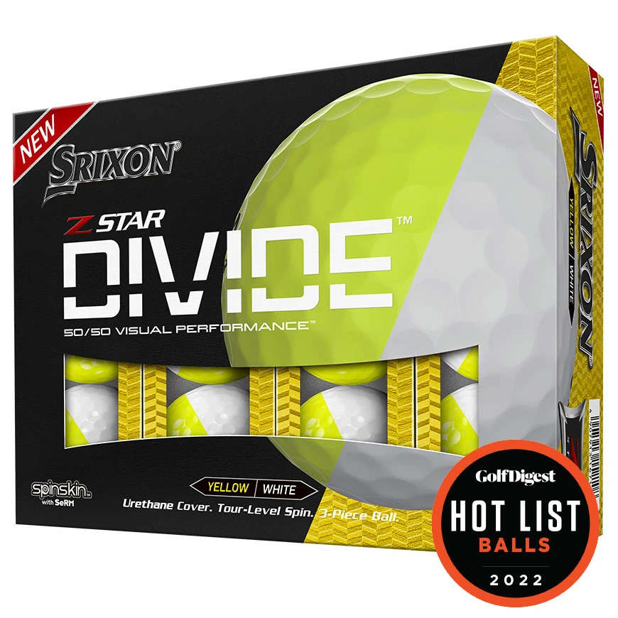 What happens when our best tour ball series goes two-toned? You get low scores and the ultimate practice ball, all rolled into one. See your line and your roll on every putt with a 360° alignment line. Then, see your spin on every chip and pitch with Divide’s unique strobe effect. You’ll practice better, play better, and enjoy a totally unique cover design, only with the all-new Z-STAR Series DIVIDE from Srixon.